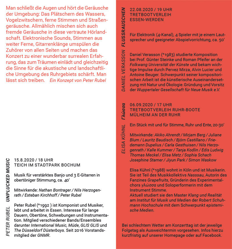 Alte Fahrt / Wandern am Kanal We’re leaving but coming back together every time. And we know. Mithilfe der Ensembleförderung des Musikfonds konnten wir die vier historischen Brücken Pelkumer Weg, Alte Fahrt, Schiefe Brücke und Dreibogenbrücke im Umkreis Olfen im Münsterland am 30. April bespielen. Die erste Performance fand um 6:18 Uhr statt, die letzte um 20:51 Uhr, gemäß der tagesgenauen Sonnenauf- und Untergangszeit. Den Tag verbrachten die Performer*innen für sich. Der Weg von Brücke zu Brücke wurde allein verbracht. Gemeinsame Zeit war nur das gemeinsame Essen und das gemeinsame Performen an den Brücken. An jeder Brücke wurde ein zuvor erarbeitetes Repertoire von circa 40 Minuten “gesungen”. Das Repertoire war darauf ausgerichtet, sich dem Ort zu nähern und mit diesem in Kontakt zu treten. Die ortsspezifischen Klänge waren gewollte Mitspieler. Ebenso die zufälligen Begegnungen mit Menschen und Tieren vor Ort. Die Performances wurden nicht angekündigt, sondern akustisch und filmisch dokumentiert. ![]() (c) Jiyun Park ![]() (c) Elisa Kühnl ![]() (c) Sophia Schach ![]() (c) Esther Rosiny-Wieland ![]() (c) Elisa Kühnl ![]() (c) Esther Rosiny-Wieland ![]() (c) Elisa Kühnl ![]() (c) Esther Rosiny-Wieland ![]() (c) Elisa Kühnl ![]() (c) Sebastian von der Heide Proben in Haus Eulenburg Frühling 2022 ![]() ![]() ![]() ![]() ![]() ![]() (c) Sebastian von der Heide Reihe M am 31. August 2021 Hubert Steins über Glossa im Deutschlandfunk Unter freiem Himmel - Neue Musik im üffentlichen Raum ![]() ![]() Cholera - I thought I should never speak again RHO & Chor Γλωσσα (Glossa) 15.02. - 14.03.2021 täglich von 17 - 23 Uhr im Kasseler Kunstverein 6.09.2020 "Soundfloat Ruhr" der Gesellschaft neue Musik Ruhr Bericht von Fritzi Schneckenhaus bei Taste like ashes, 2021 ![]() (c) Harriet Meyer ![]() ![]() ![]() (c) heike Kandalowski ![]() ![]() |