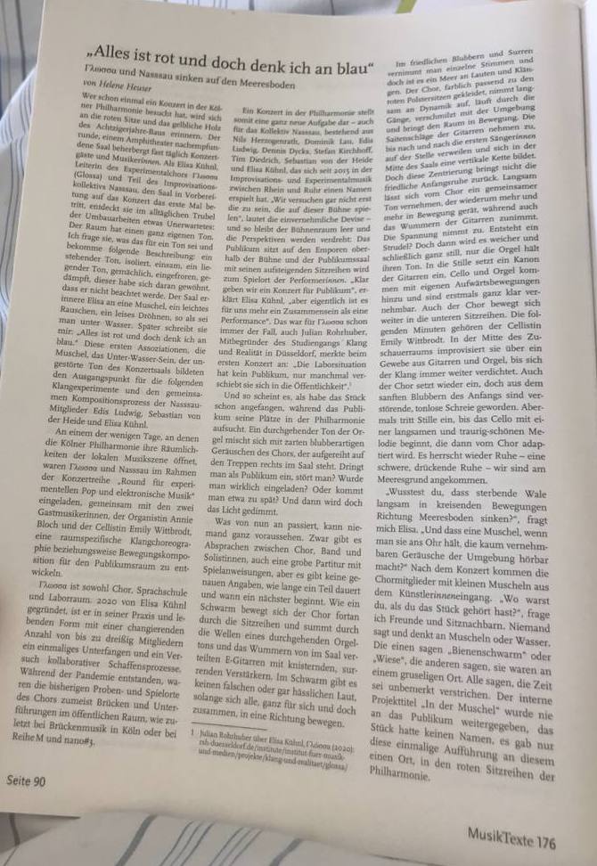 Γλωσσα (Glossa) ist griechisch und bedeutet übersetzt: Zunge und Sprache. Ein Teekesselchen. Mein Teekesselchen liegt im Mund. Mein Teekesselchen wird gesprochen. Γλωσσα ist ein Ensemble, eine Sprachschule, ein Laborraum und ein Chor. Der aus bis zu 30 Personen bestehende Chor Γλωσσα (Glossa) erforscht die klanglichen Potentiale der individuellen Stimmen, arbeitet an der Entwicklung einer eigenen Klangsprache, entwirft und realisiert eigene Scores. Seit Anfang 2020 entstehen in der gemeinsamen Chorpraxis auf diese Weise immer wieder neue, überraschende und zuweilen befremdliche Momente. Die Fokussierung auf die Stimme beinhaltet dabei ebenso das Interesse, zu ergünden, inwiefern die menschliche Stimme trotz alltäglichen Gebrauchs, noch immer schambelastet ist, gewissen Regelwerken gehorcht und Stereotypen unterliegt. Das Projekt Γλωσσα eröffnet den Chorteilnehmer*innen (Laien und Berufsmusiker*innen) einen Raum, ihre individuellen Stimmen experimentell zu entdecken – und dabei selbstverständlich auch schräg, laut, schief und ungewohnt zu sein. Die Stimme fungiert hierbei als ein primäres Versuchsobjekt, jedoch besteht in den sich entfaltenden Freiheitsgraden der gemeinsamen stimmlichen Praxis und Etablierung eines verbindenden Raumes der eigentliche Forschungsschwerpunkt des Projektes. Die Stimme als überaus variables Instrument zur Untersuchung gegebener Umstände und als Auslöser zur Entstehung eines sozialen Konstruktes. Glossa sind: Akiko Ahrendt, Tim Abramczik, Julia Anglin, Lauritz Baudisch, Sophie Emilie Beha, Mirjam Berg, Isabelle Brissy, Juliane Blum, Helen Brecht, Björn Castillano, Friedemann Dupelius, Sebastian von der Heide, Nils Herzogenrath, Verena Klever, Tanja Kodlin, Aylin le Claire, Edis Ludwig, Leonie Ludwig, Thomas Meckel,, Elisa Metz, Jiyun Park, Ella Posney, Leonie Teika, Esther Rosiny-Wieland, Sophia Seiss, Sophia Schach , Josephine Stamer, Simon Steinhorst, Simon Waskow, Marcus Zilz Knoten Working with Archives im Makroscope e.V. ![]() ![]() Karl Sczuka Research Scholarship in collaboration with the Goethe-Institut. SWR Kultur about the project.![]() Foto: Friedemann Dupelius Glossa & Nasssau in der Kölner Philharmonie am 20.01.2023 ![]() foto Jonas Juisten Helene Heuser über IN MUSCHEL in der Zeitschrift MUSIK TEXTE ![]() Brückenmusik / Brückenlabor Five guided concert tours through the Deutzer Brücke in memory of Peter Behrendsen (1943-2021) founder of Brückenmusik.