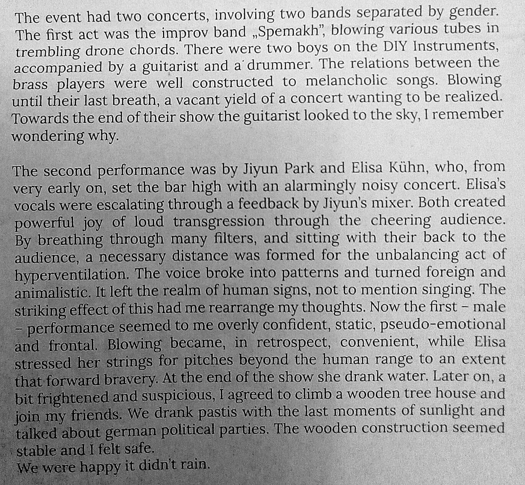 Noisy hyperventilation There is time to play. We are searching for details of the voice apart from well tuned experiences and also allow the well tuned sound to comfort us. It is a duett of diverse power. Kraphük is a collaboration with jiyun park Kraphük at Mutant Radio Kraphük at Micro currents Krap Huek at Seanaps Festival 2022 ![]() ![]() ![]() aus: "it tastes like ashes, gratis kritik", 3. ausgabe, juni 2019 ein text von jonathan omer mizrahi |